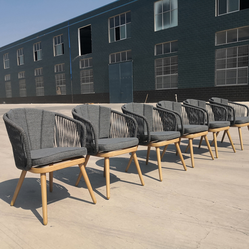 | Main Material Used and Specifications | 7pcs rope furniture grey patio dining set with waterproof cushions 1) Dia5mm round rope hand-woven 100%; 2) Main tube: Dia25*1.2mm on chairs; 3) 200g Olefin removal and waterproof cushion covers with zip, 5cm thickness 4) 5mm tempered art glass; |