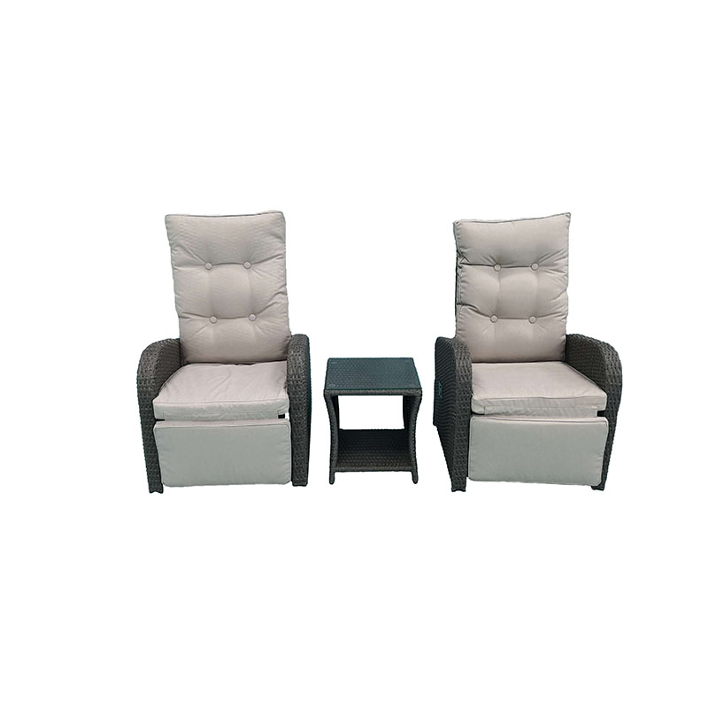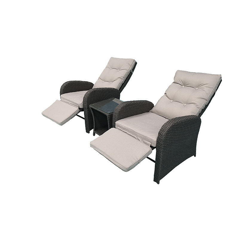 Specifications | Aluminium rattan recliner sofa chair set 1) 220g Olefen or polyester fabric 8cm thickness cushion; 2) Main tube: Aluminium powdeer coated 1.2mm thickness; 3) Twin-rattan woven with grey popular color; 4) Side table with 5mm tempered glass; G.W.:33.90kgs/set/carton; 5) Color: Grey rattan on frame and fabric; |